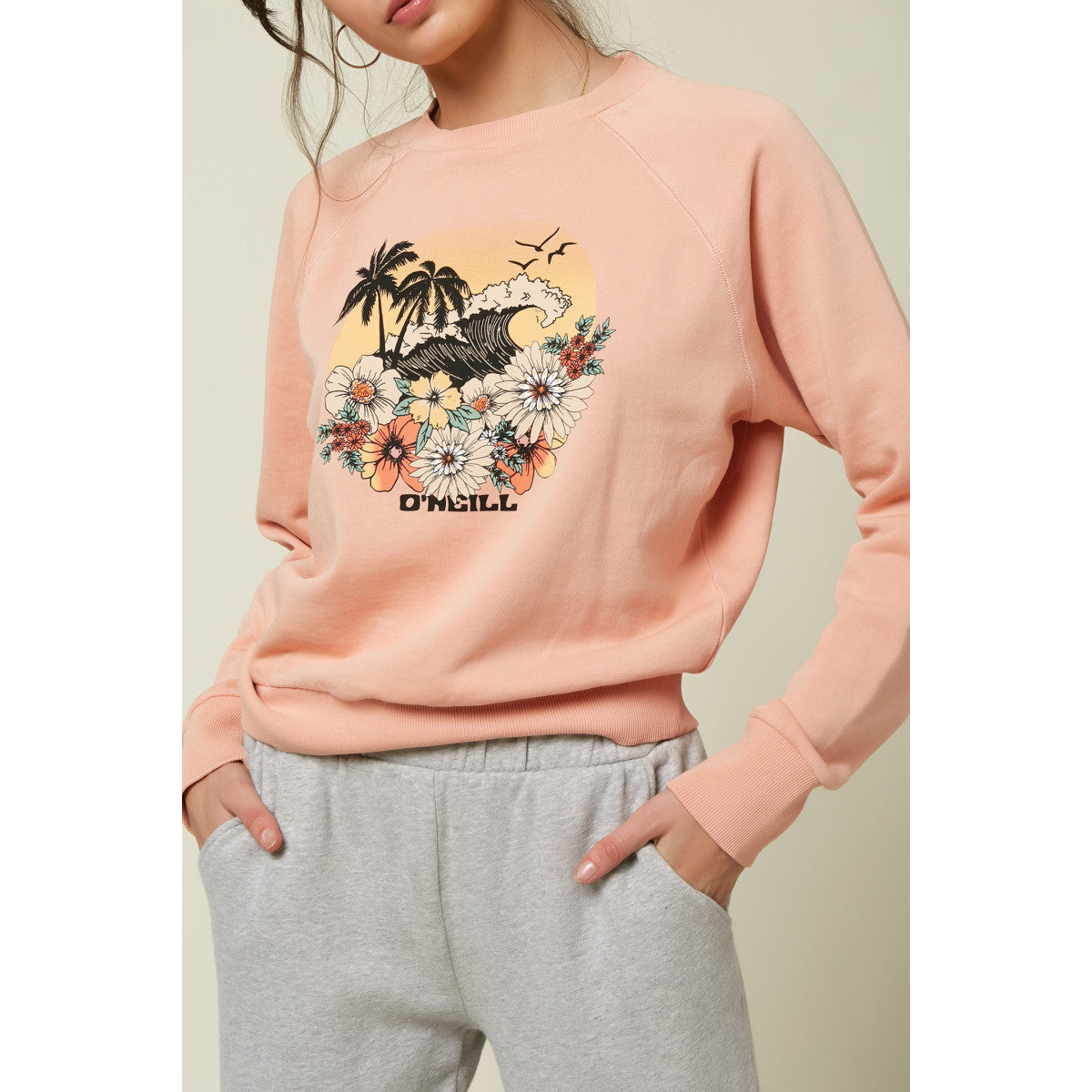 Pullover fleece, 100% cotton, garment pigment dyed, 22" HPS length, graphic art, rib collar and cuff and hem, metal logo badge.