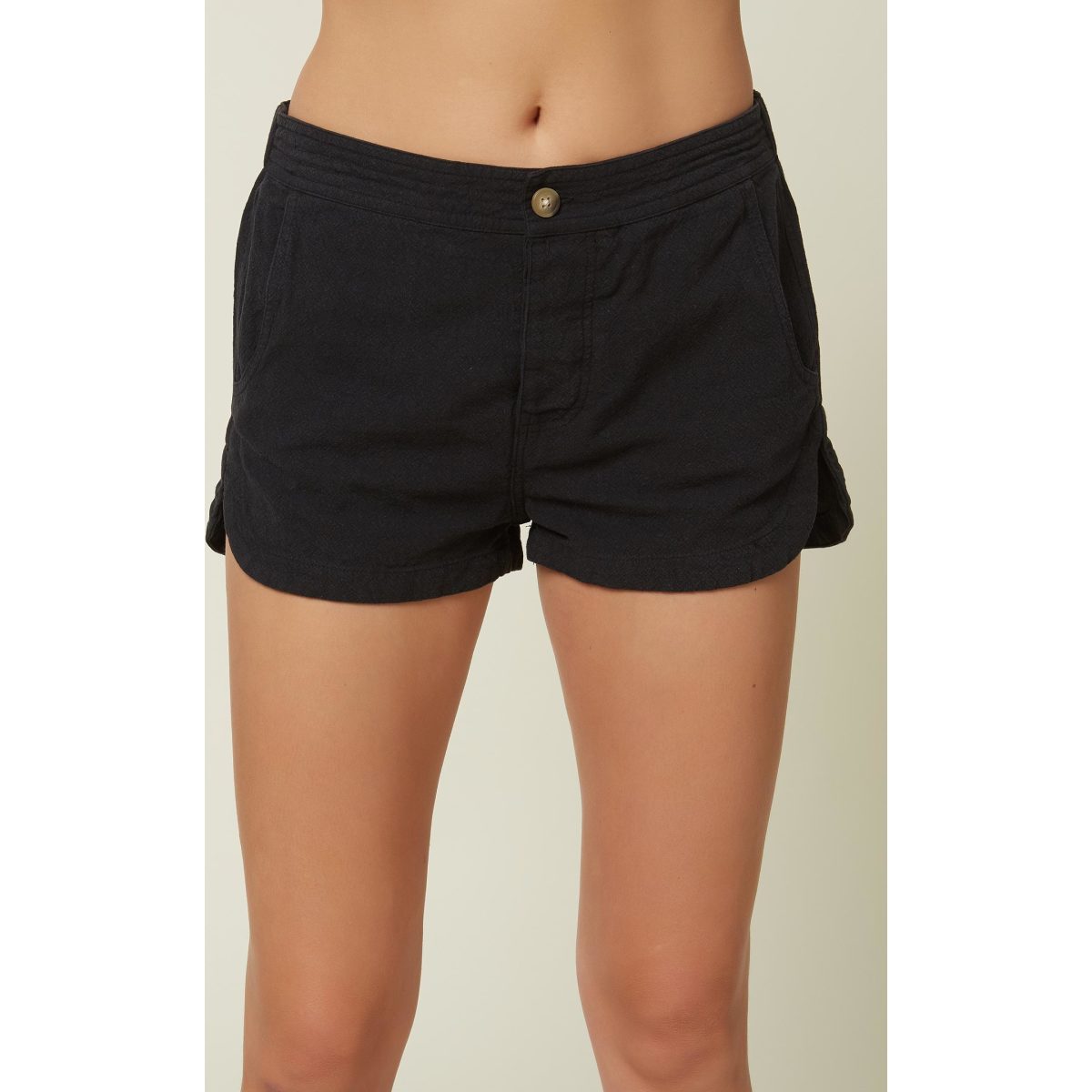 Woven short, 55% linen 45% cotton, 1 1/2" inseam, button CF fly, dolphin hem, elastic back WB, metal logo badge.