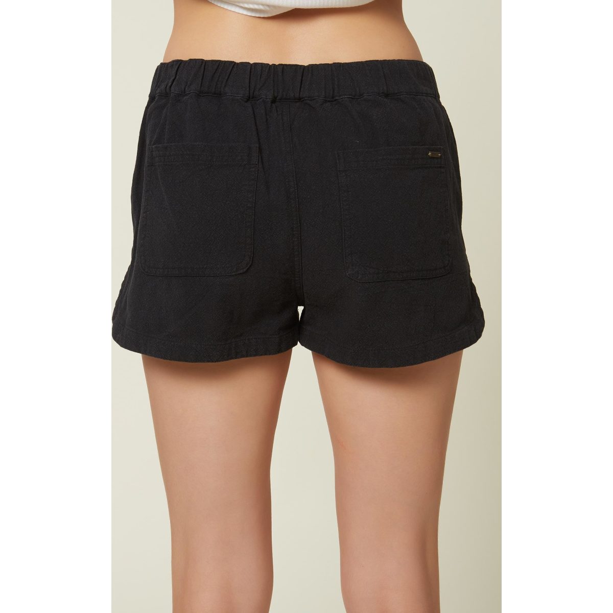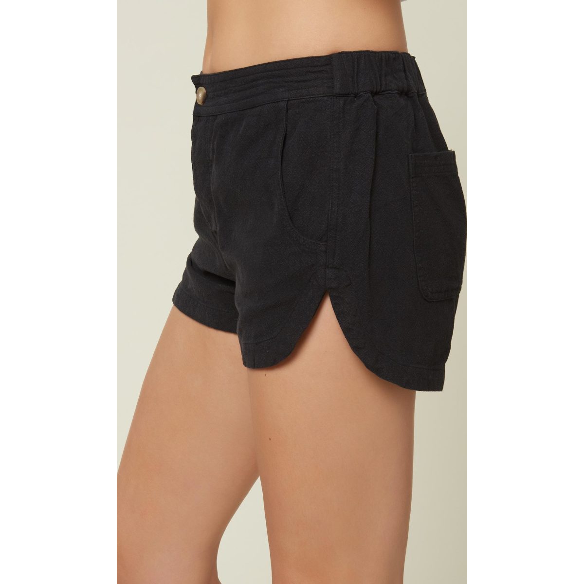 Woven short, 55% linen 45% cotton, 1 1/2" inseam, button CF fly, dolphin hem, elastic back WB, metal logo badge.