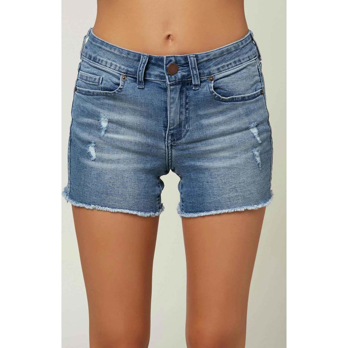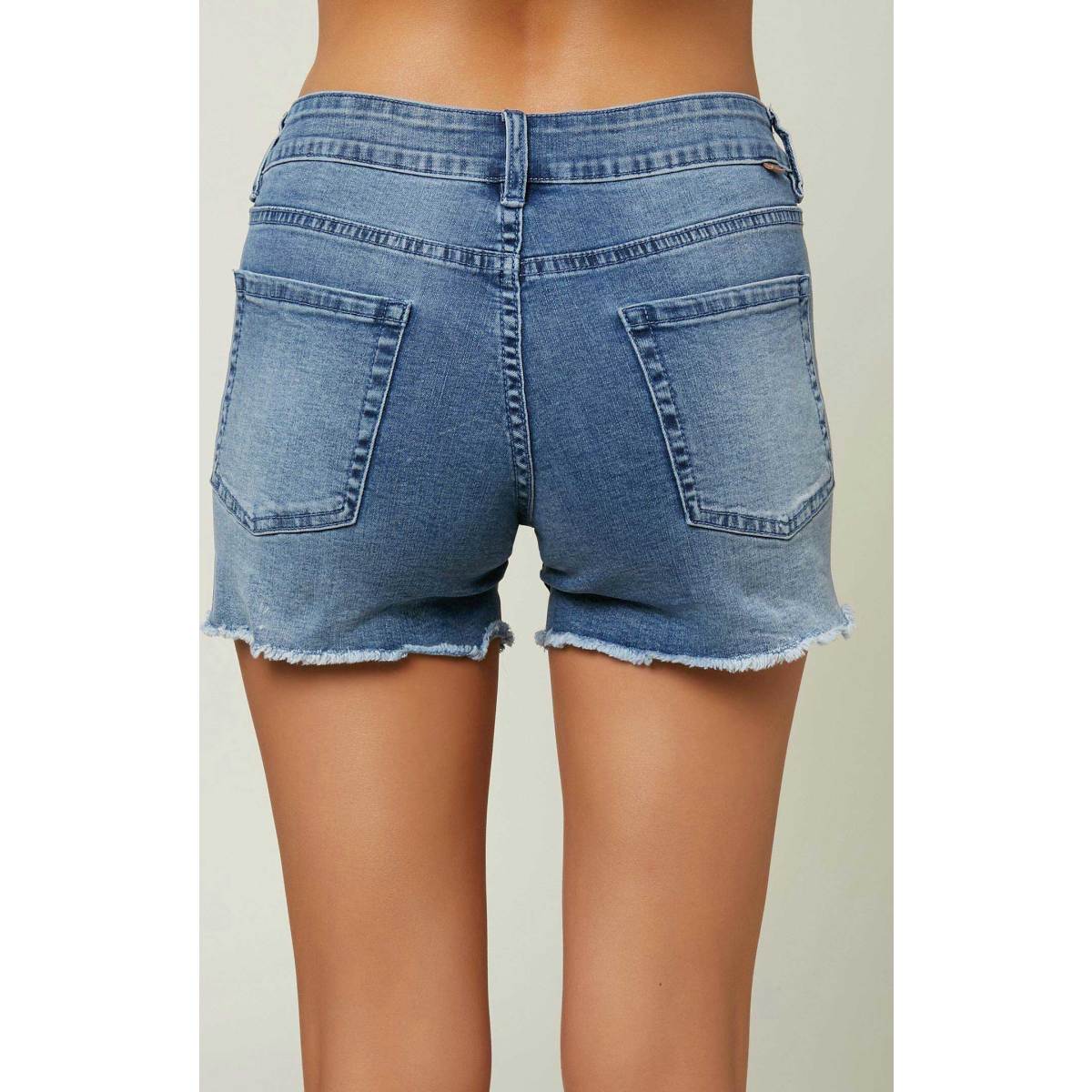 Denim short, 98% cotton 2% elastane denim, 4” inseam, 8 1/2" front rise, raw hem, destruction, logo flag label.