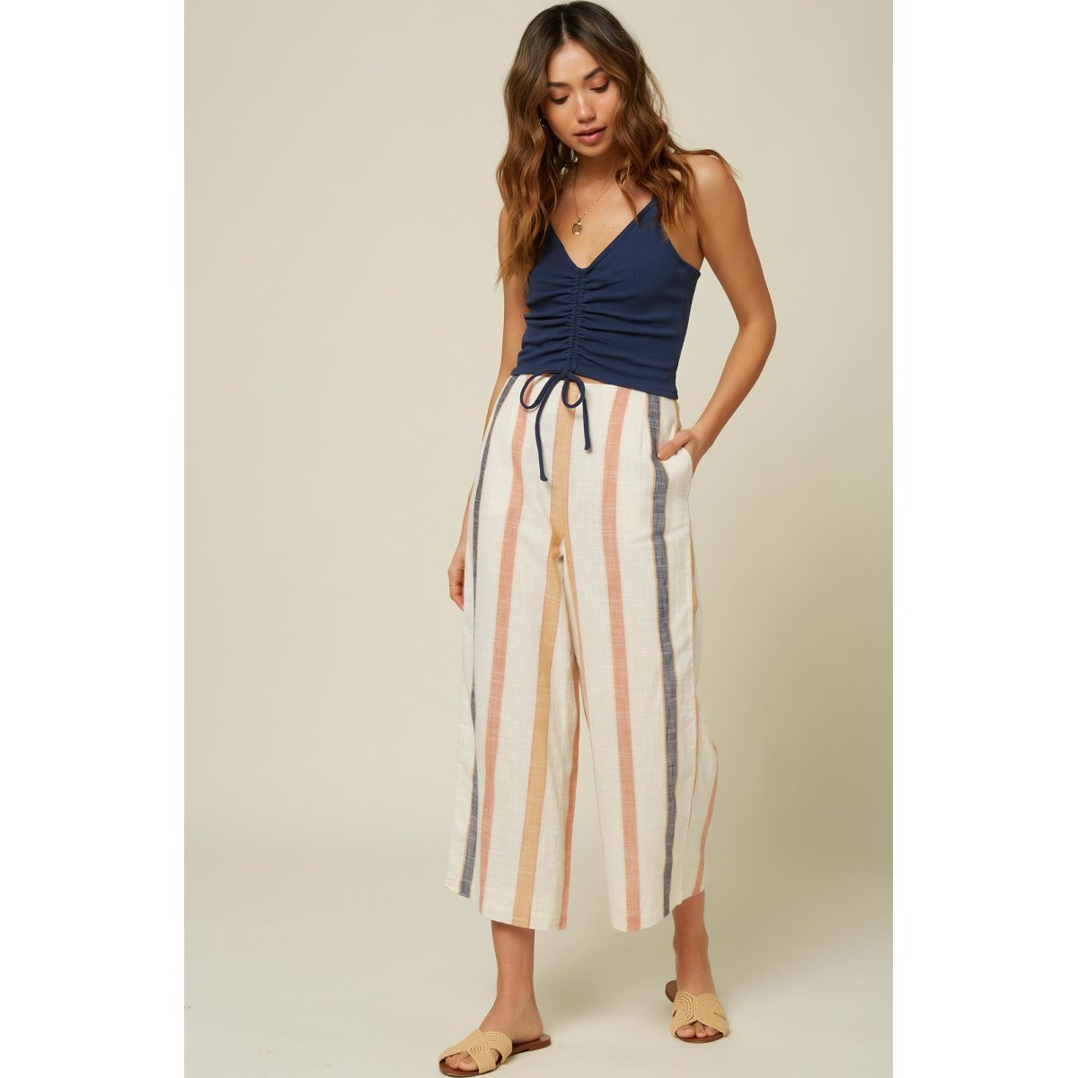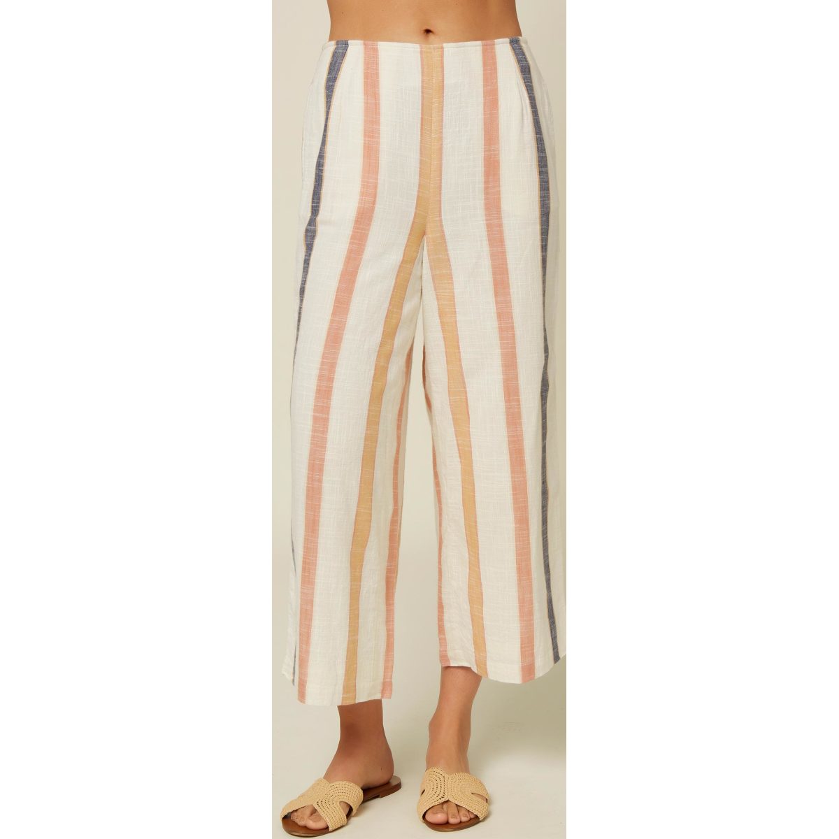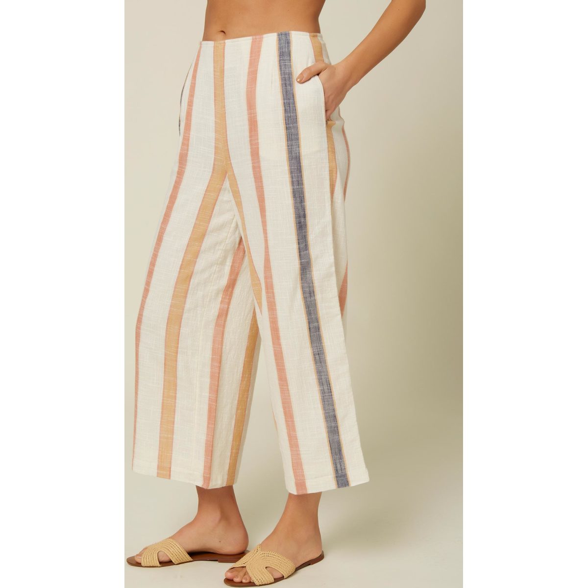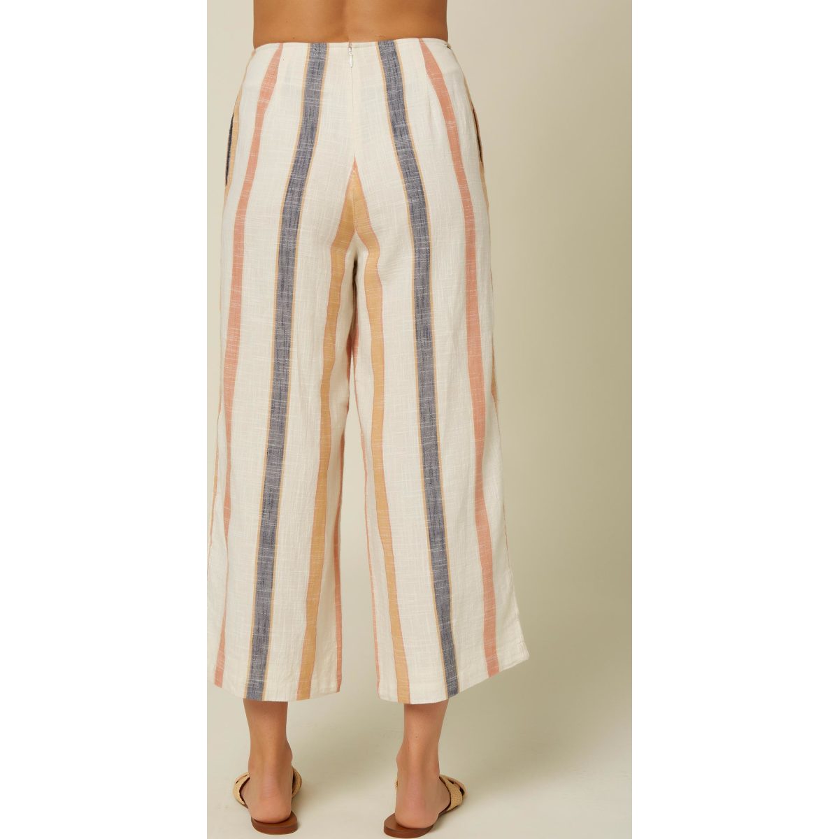 Woven pant, 60% cotton 40% viscose, 24 1/2" inseam, 12" front rise, hidden zipper at CB, side seam pockets, metal logo badge.