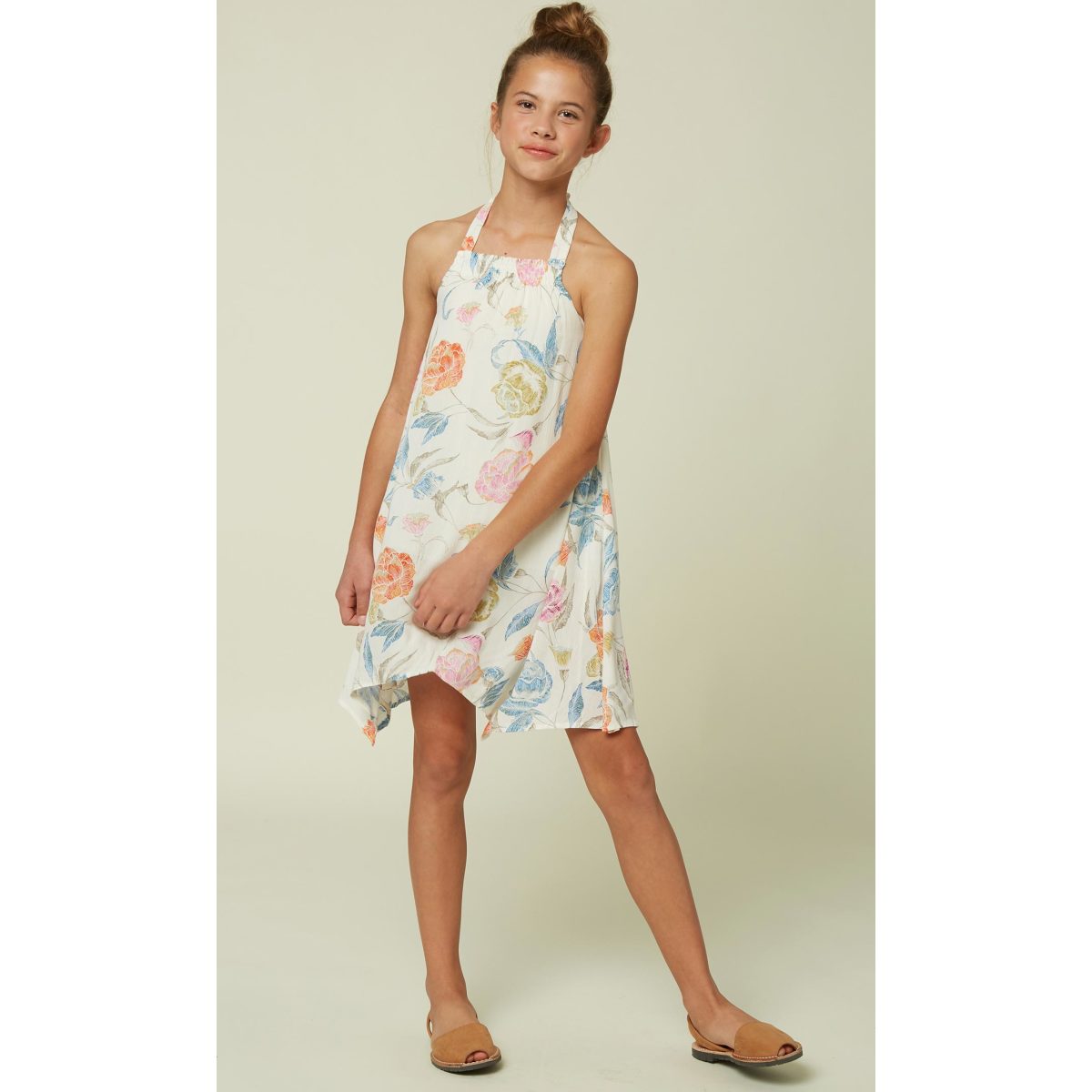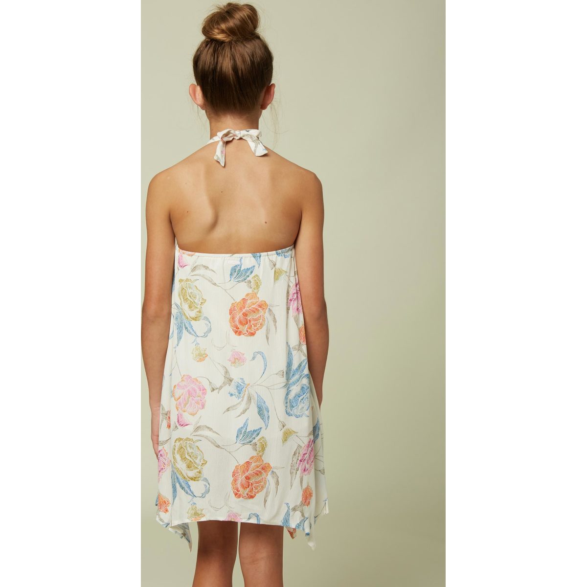 Woven dress, 100% viscose, 25 1/2" CF length, halter tie, smocked neckline, handkerchief hemline, lining, logo patch