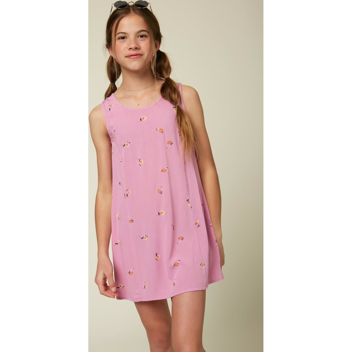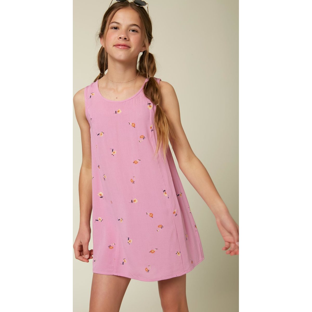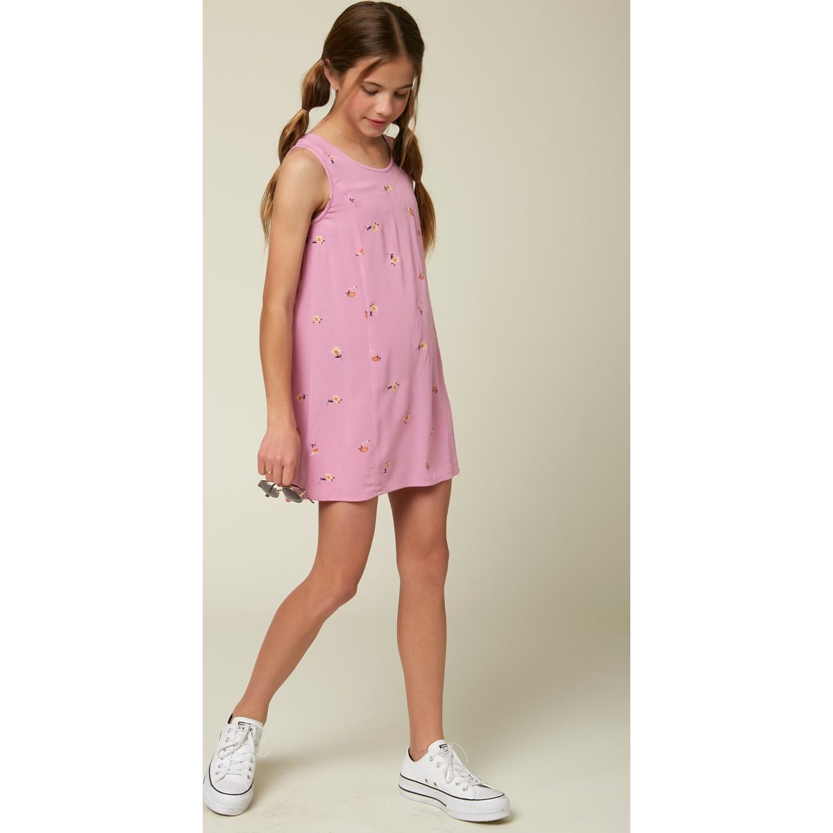 Woven dress, 100% viscose, 28 1/2" HPS length, open back with button closure, logo patch