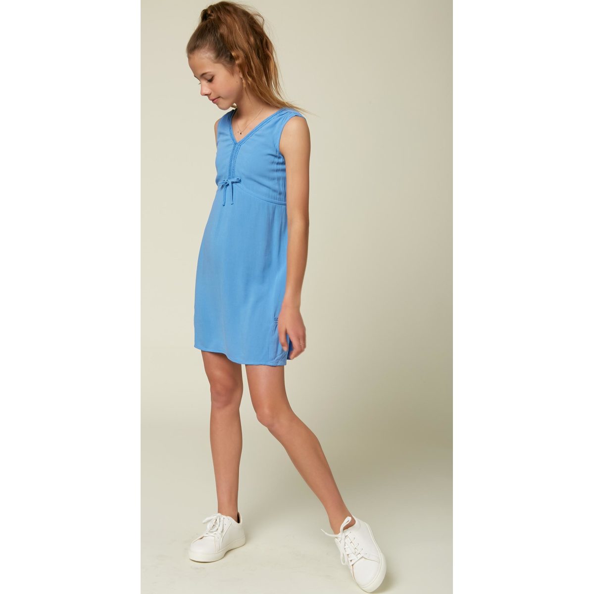 Woven dress, 90% viscose 10% linen, 28" HPS length, crochet trim detail, elastic at back waist, logo patch