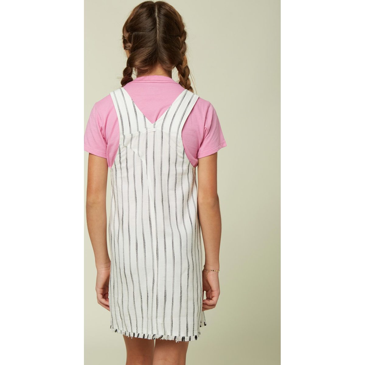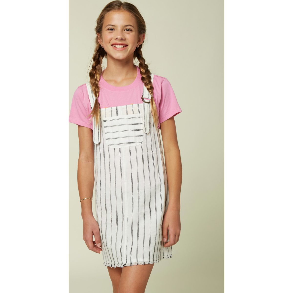 Woven overall dress, 60% cotton 40% viscose, 29 1/2" HPS length, front pocket, adjustable straps, logo patch