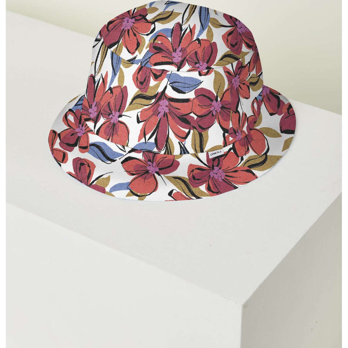 Reversible bucket hat, allover printed poly (side 1), cotton terry (side 2), embroidery art, logo flag label