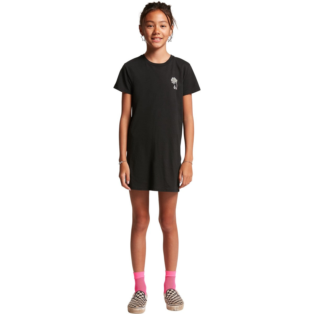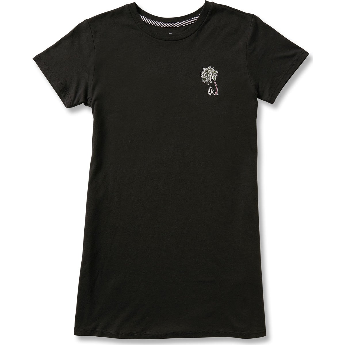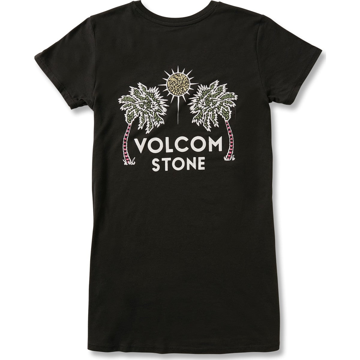 The perfect beach cover up or weekend go-to , the girls Truly Stoked short sleeve t-shirt dress features Volcom palm tree artwork on the front and back.