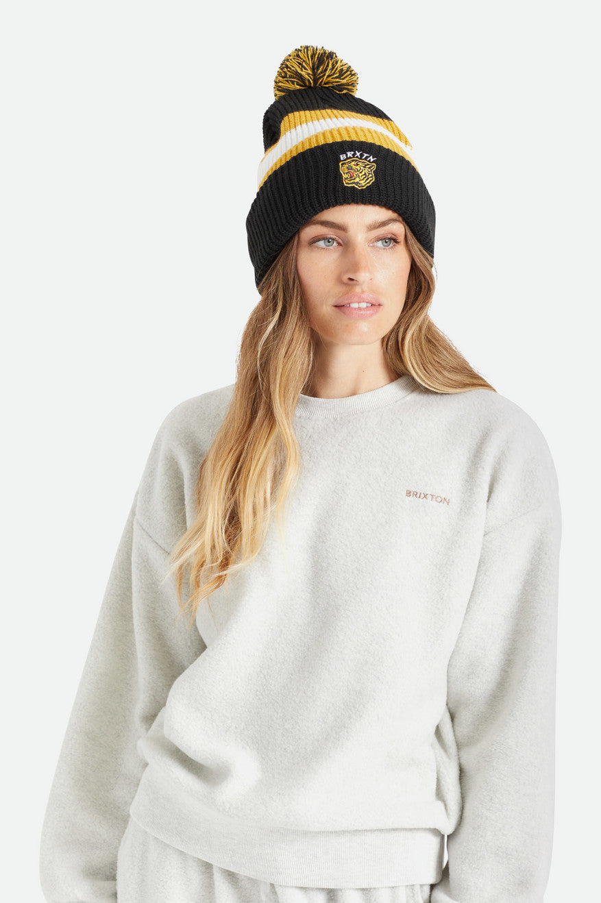 The Kit Pom Beanie is a cozy acrylic beanie in a 2X1 chunky knit. Crisp jacquard stripes contrast the two-tone pom while custom direct embroidery decorates the cuff.