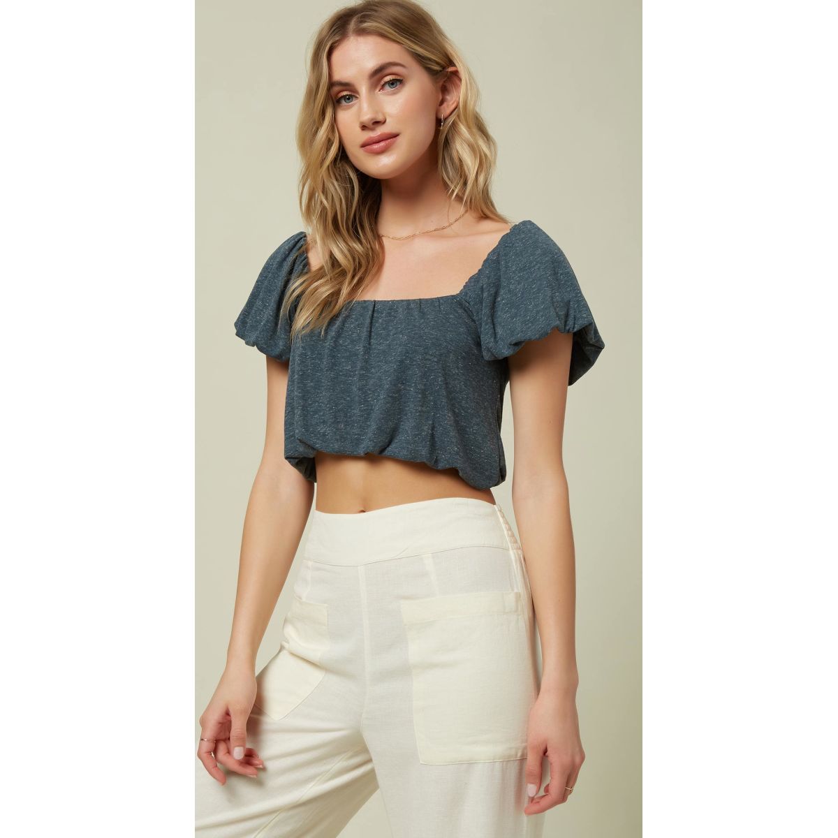 Short sleeve knit top, 65% poly 35% linen heathered jersey, 16" HPS length, self lining, metal logo badge.