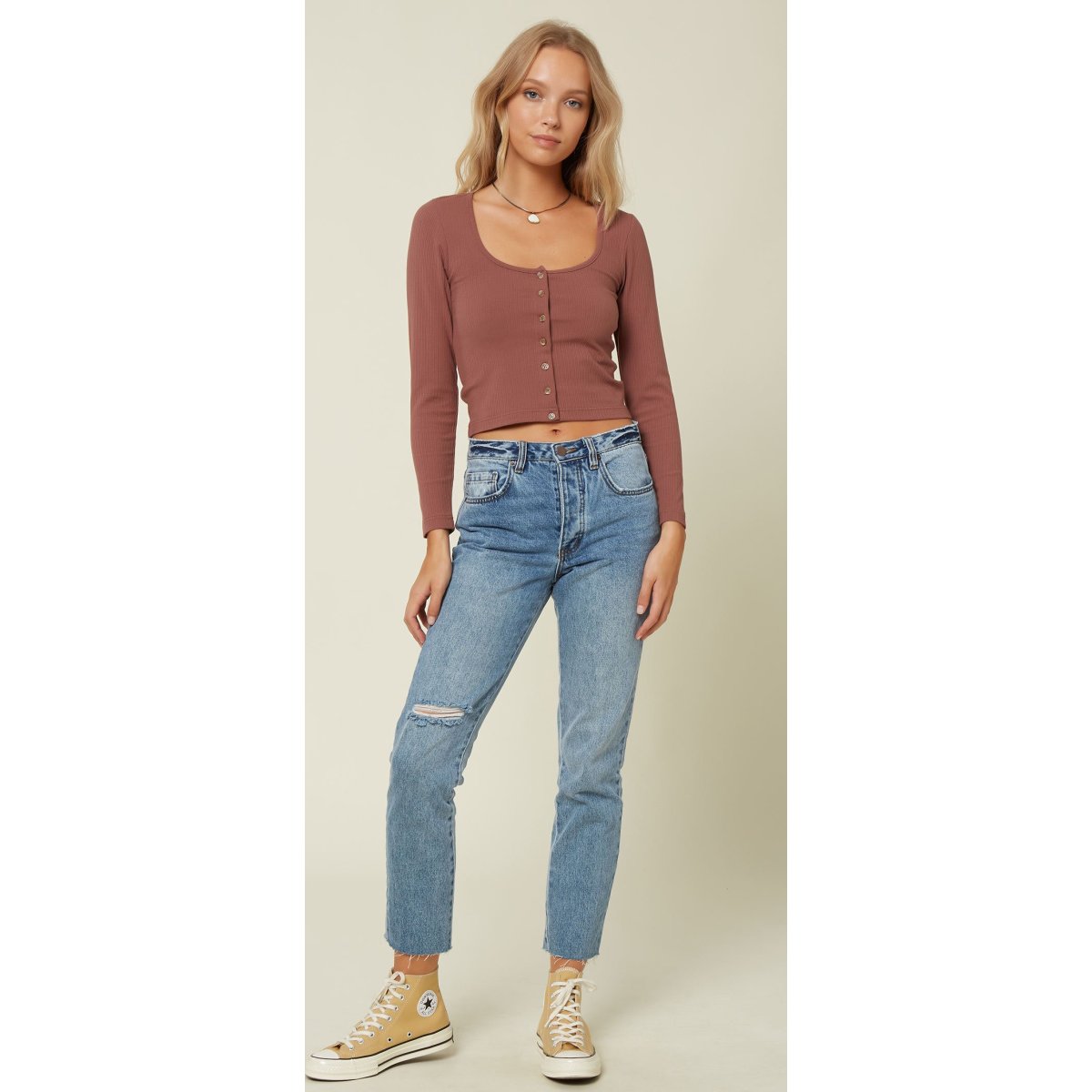 Long sleeve knit top, 95% cotton 5% elastane rib knit, 19" HPS length, button front placket, metal logo badge.