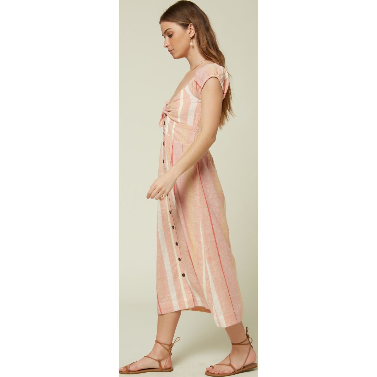 Woven midi dress, 66% viscose 34% cotton y/d stripe, 38" CF length, knot tie front with button placket, smocked back, metal logo badge.