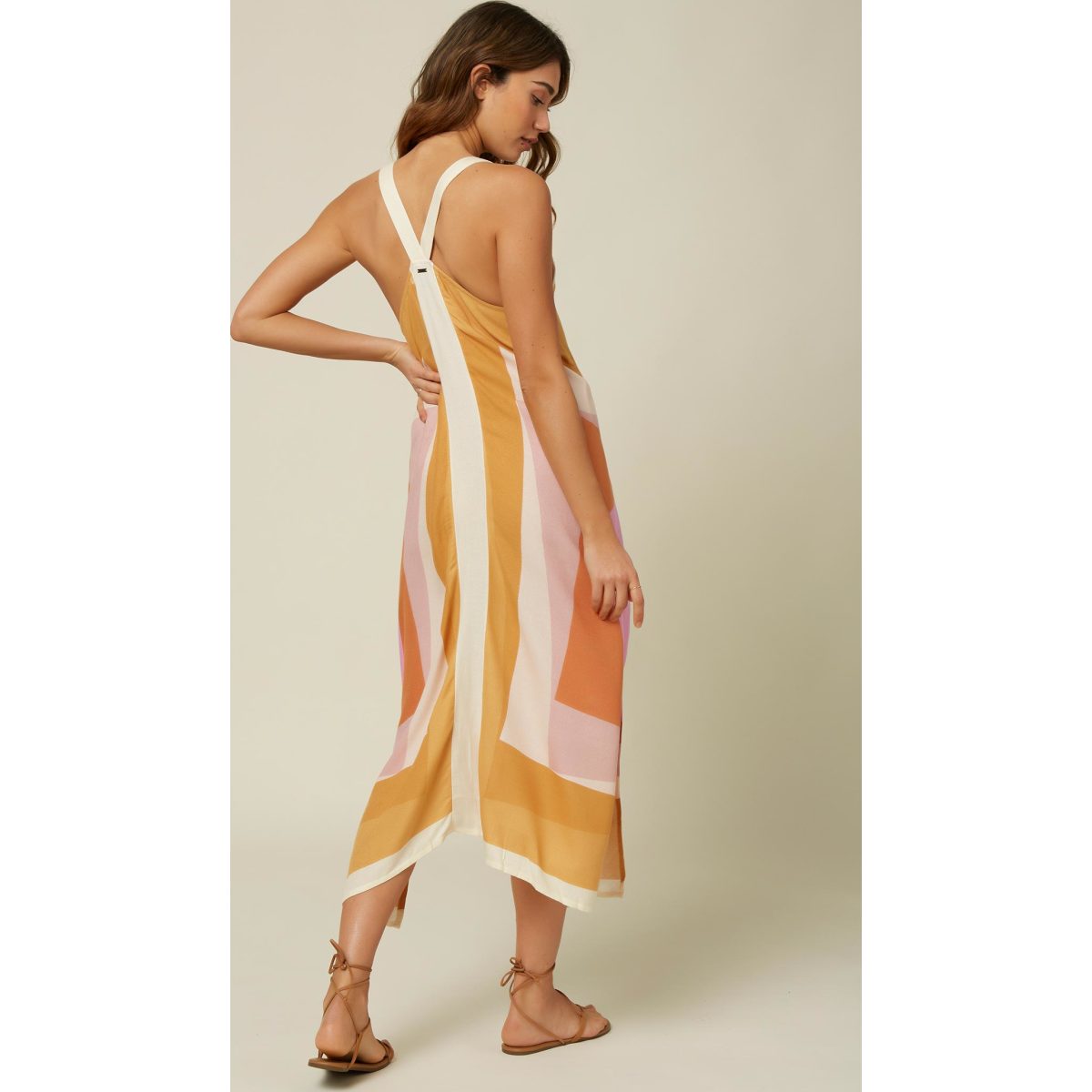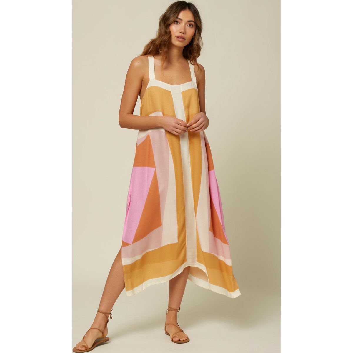 Woven tank midi dress, 100% viscose with placed print, 36" CF length, metal logo badge.