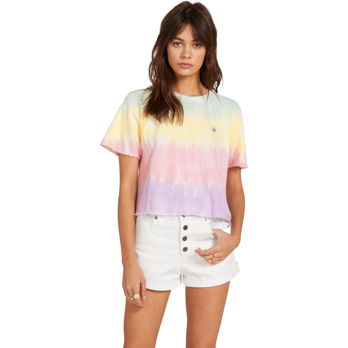 Short sleeve raglan crew neck with raw edge sleeves and hemline