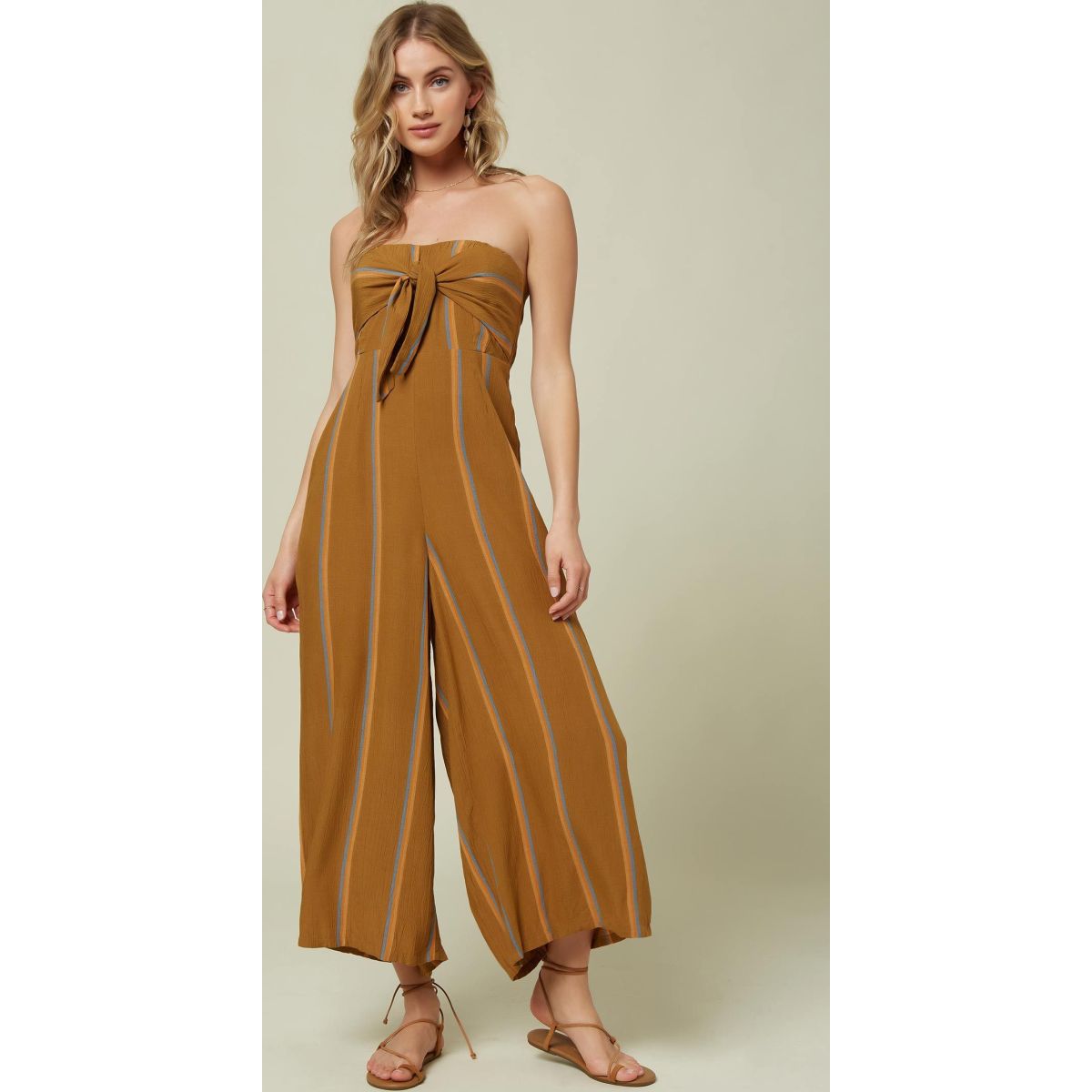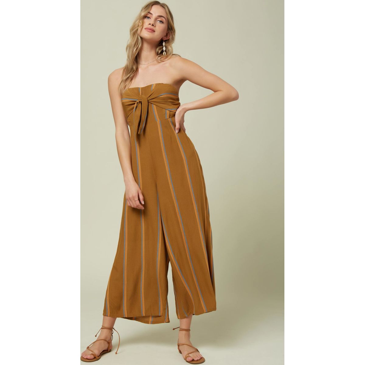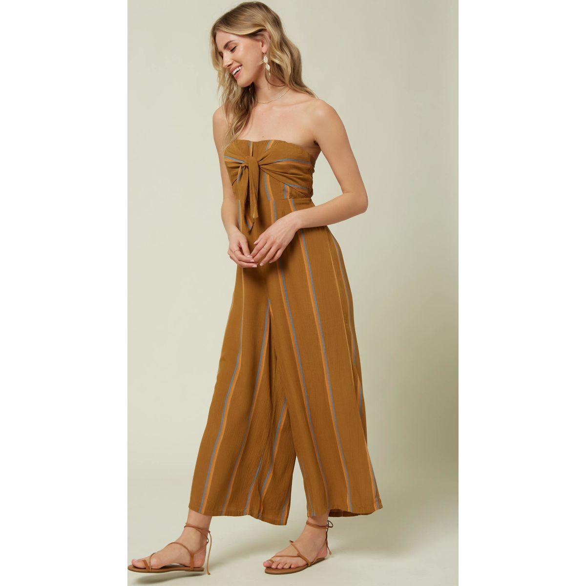 Woven tube jumpsuit, 100% viscose, 23" inseam, self tie at front bodice, smocked back bodice, gel tape at interior top opening, metal logo badge.