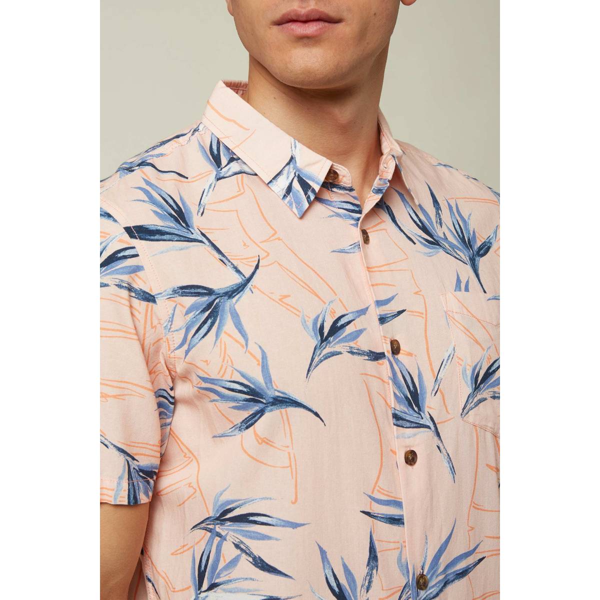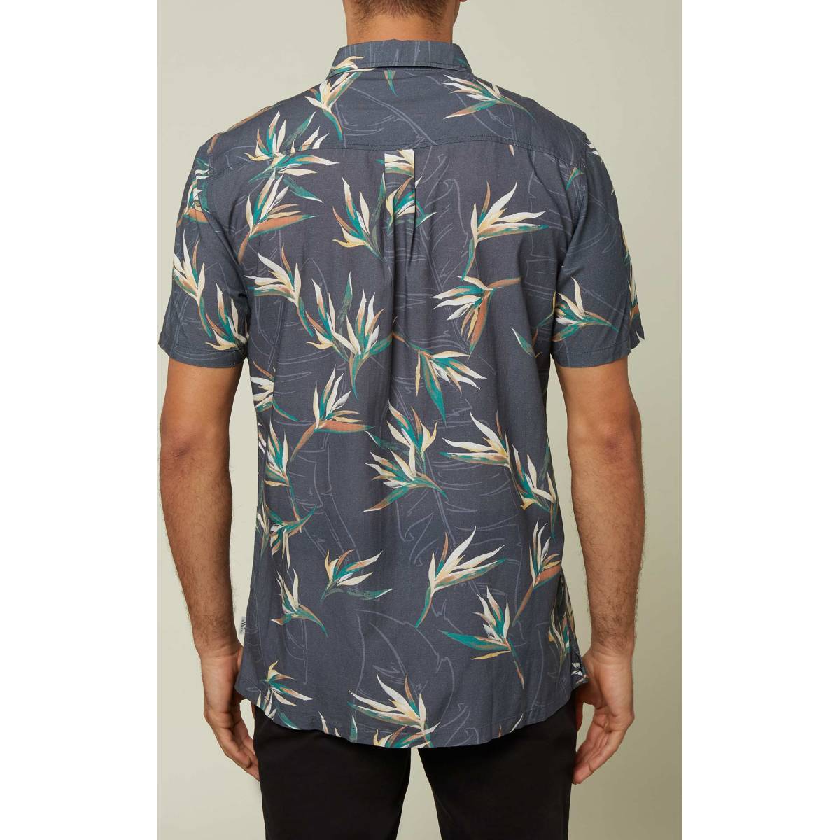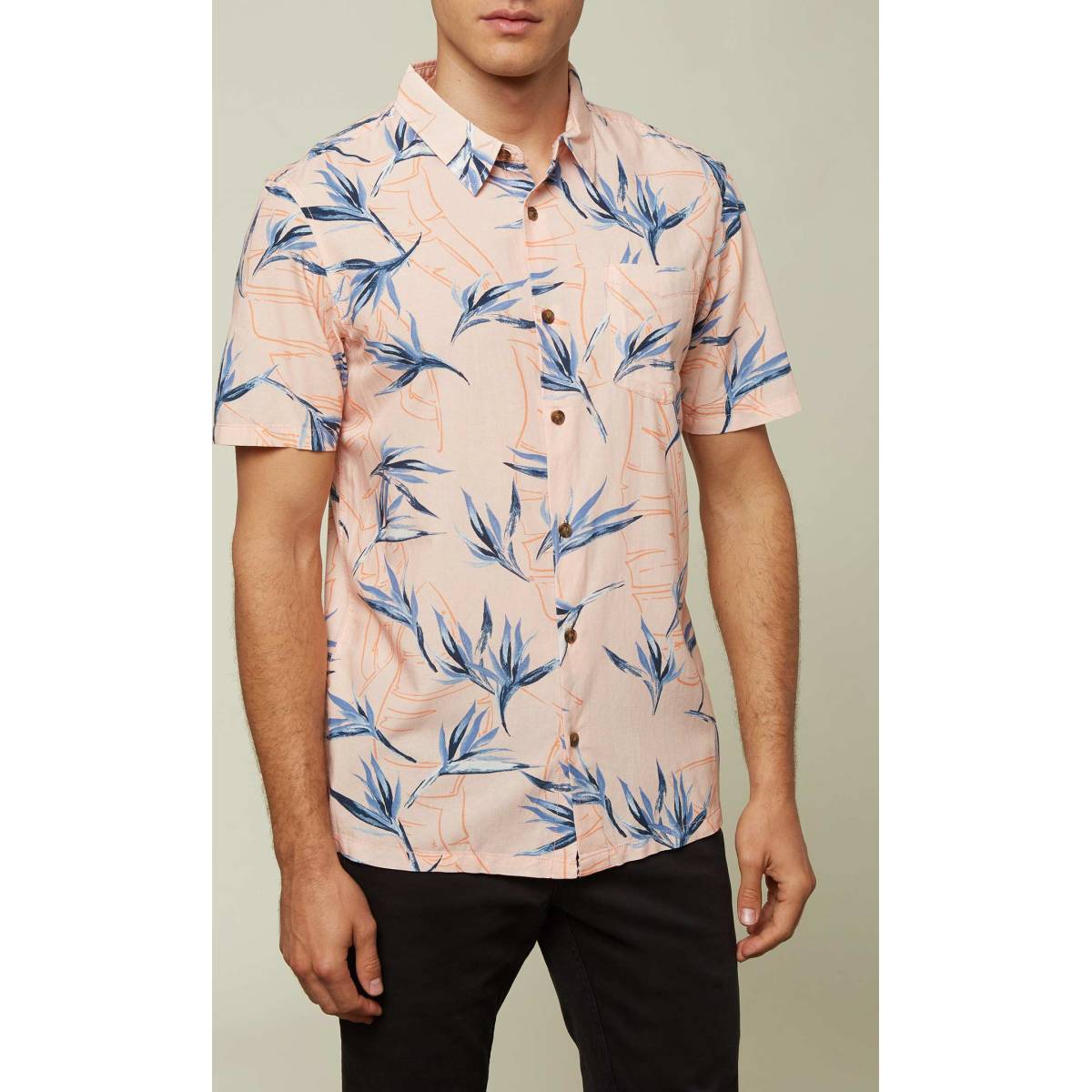 Relaxed Fit 55%Rayon 45%Cotton blend printed short sleeve shirt Horn buttons, straight hem body Woven logo label at side seam