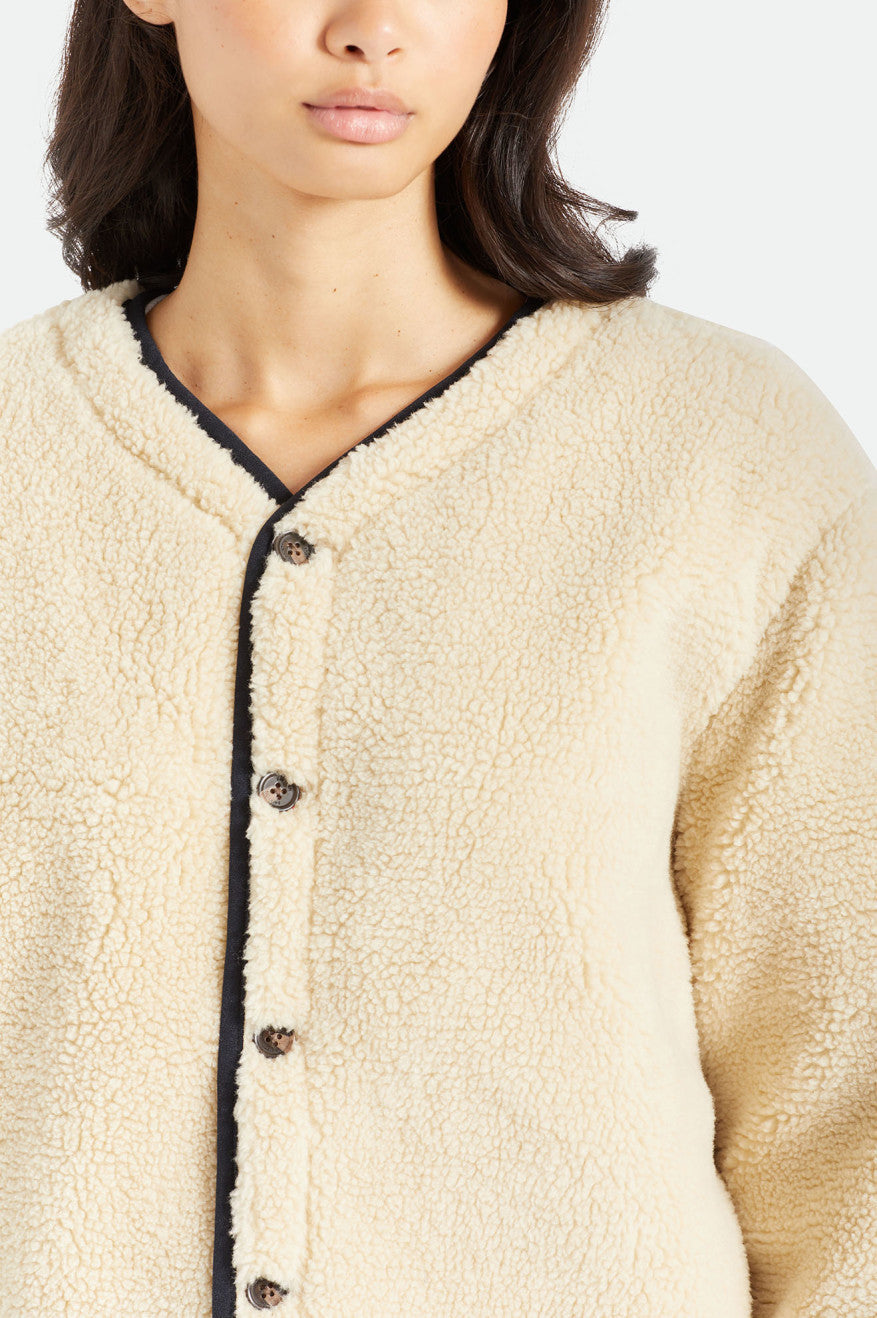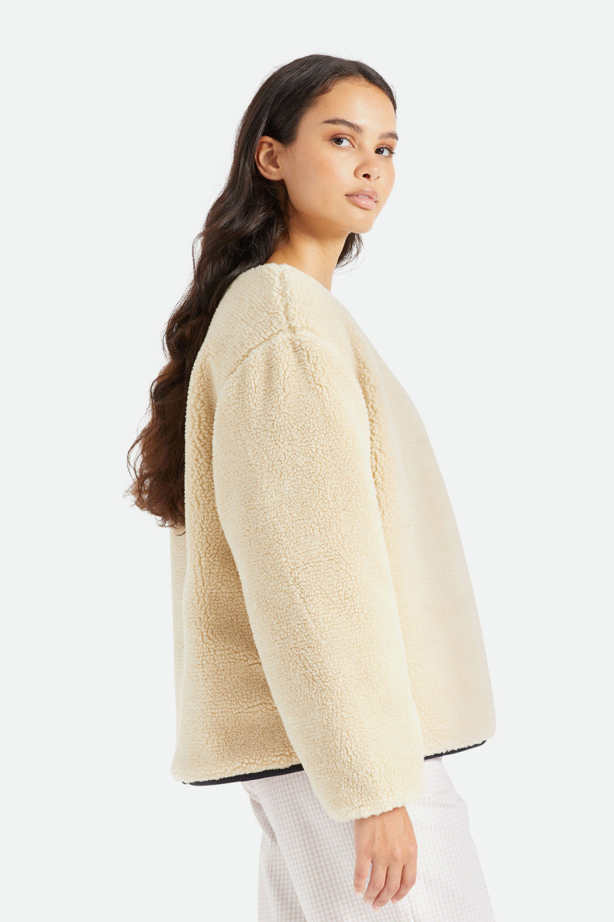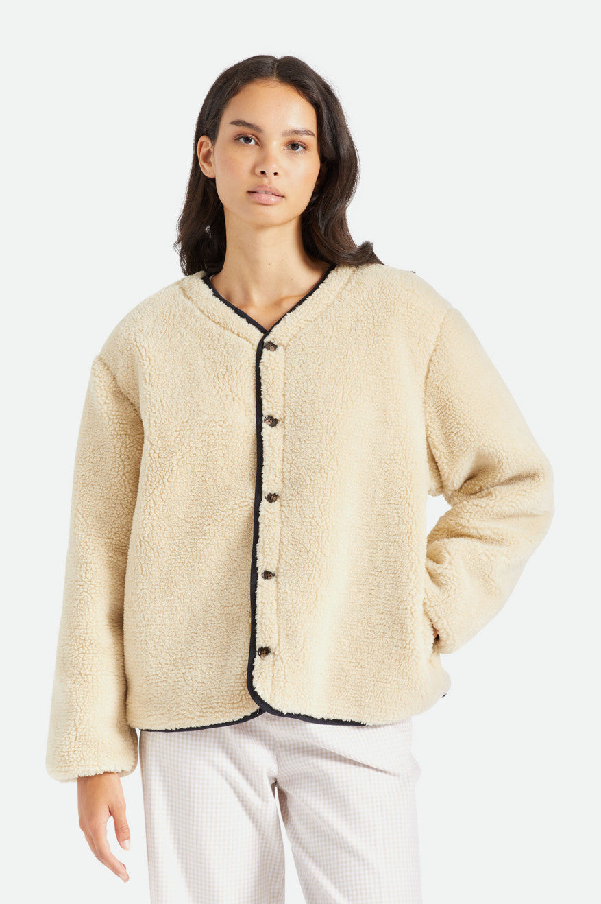 Like the perfect vintage piece you've been searching for, this is a bomber-inspired jacket with a just-right fit. The interior is lined with cozy sherpa fleece while the exterior boasts textured onion quilting. Reverse the jacket to show the fuzzy finish and turn your new favorite into a neutral layer. Detailed with horn buttons and elastic sleeve cuffs.
