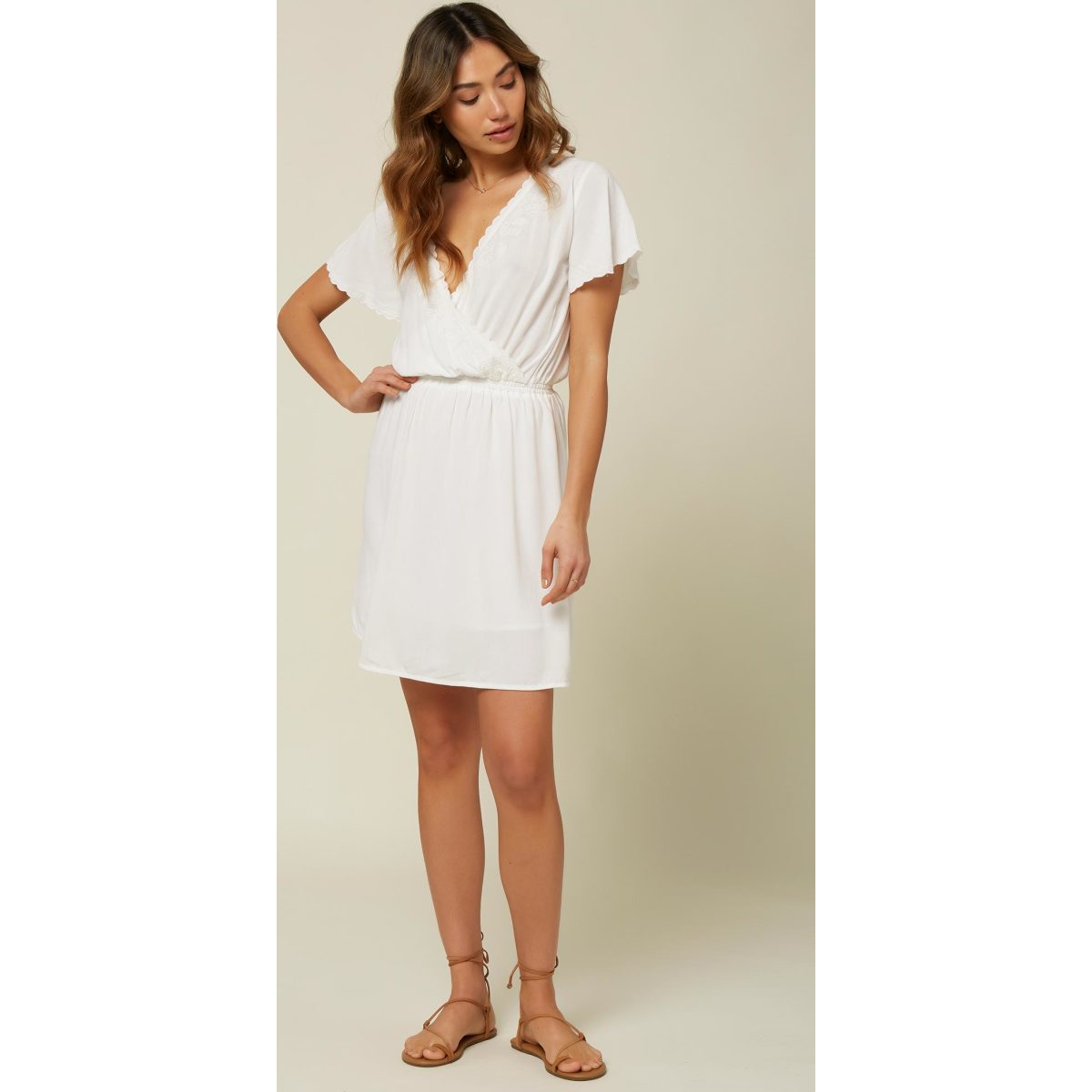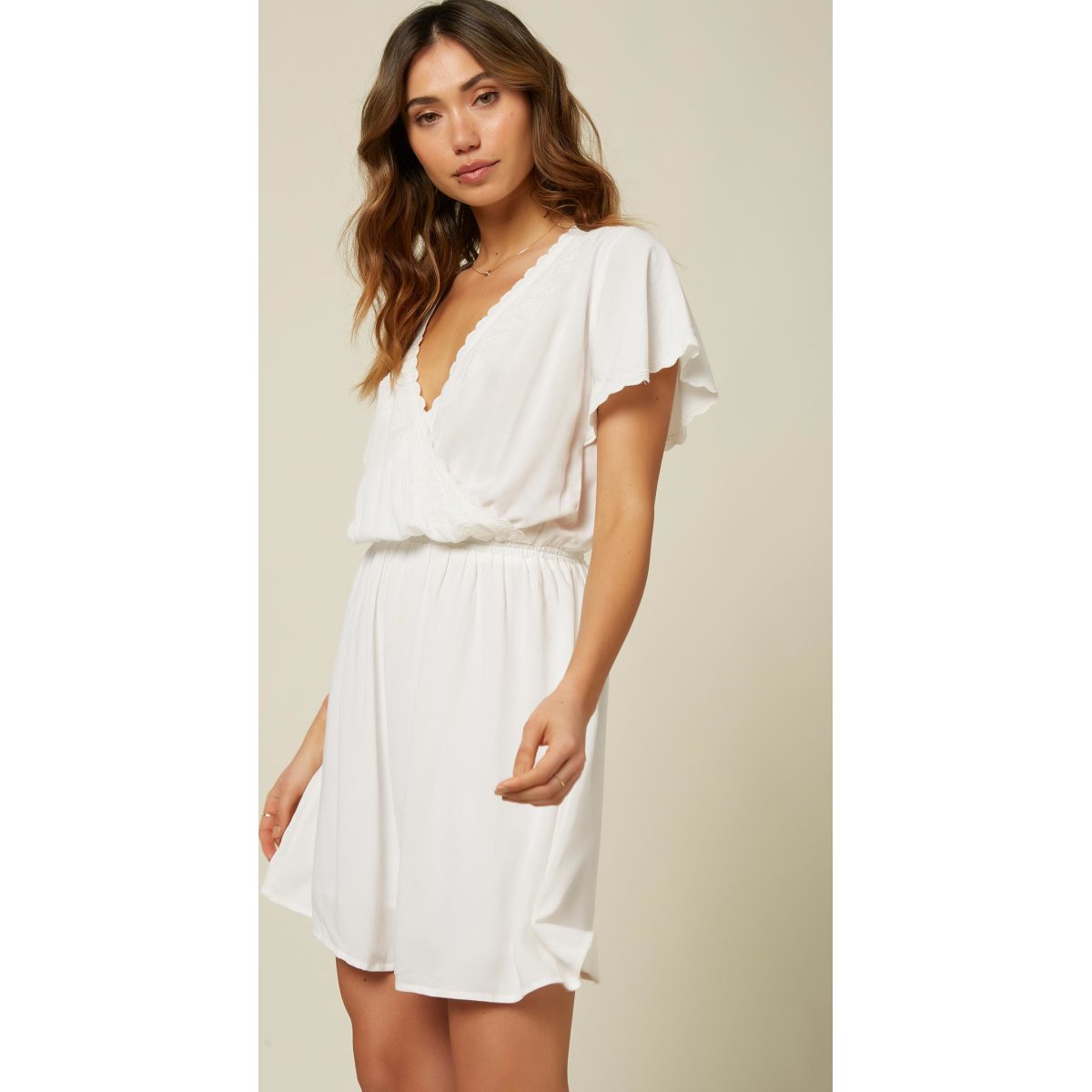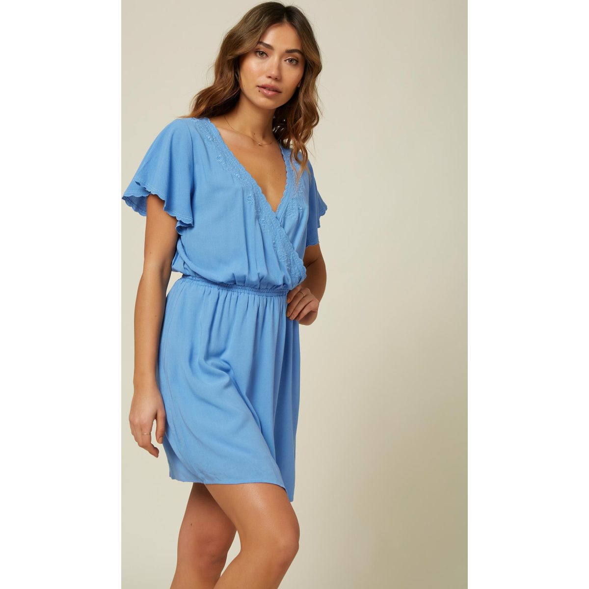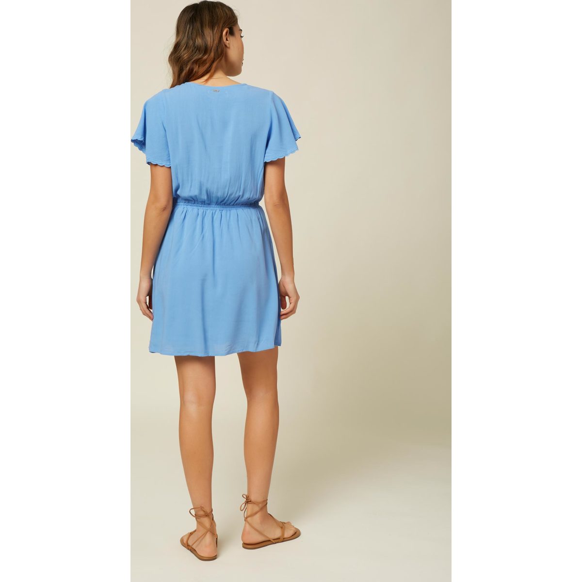 Short sleeve woven dress, 90% viscose 10% linen, 34" HPS length, embroidery at neckline and sleeve, smocked waistband, metal logo badge.