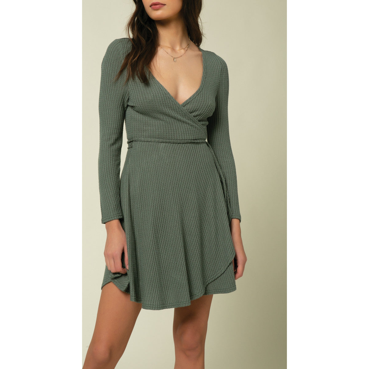 Knit long sleeve short dress, 61% viscose 34% polyester 5% elastane, 32" CB length, wrap front, self belt, metal logo badge.