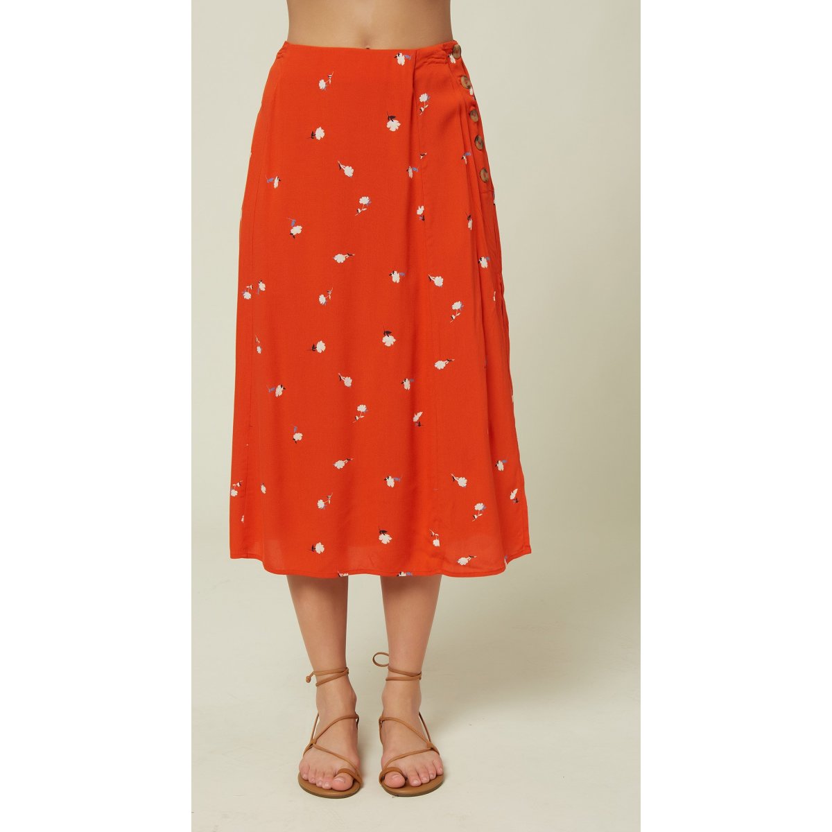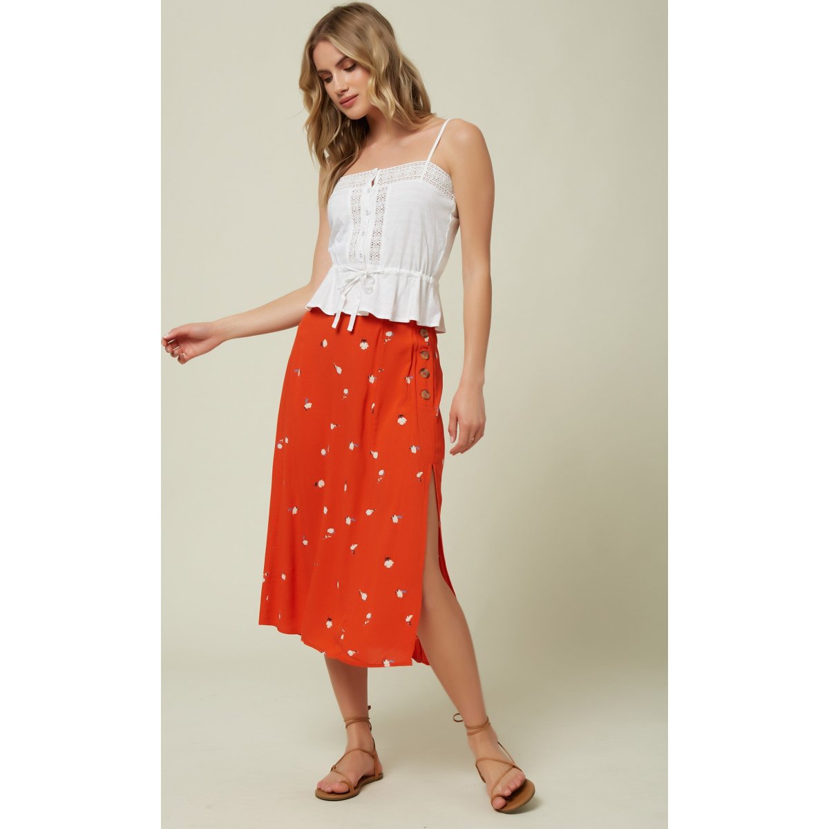 Woven skirt, 100% viscose, 34" CF length, button placket at side seam, side slits, metal logo badge.