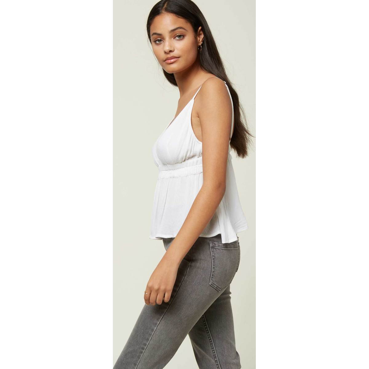 Woven tank, 100% viscose, 16 1/4" HPS length, encased elastic at empire waist, strap adjusters, metal logo badge.